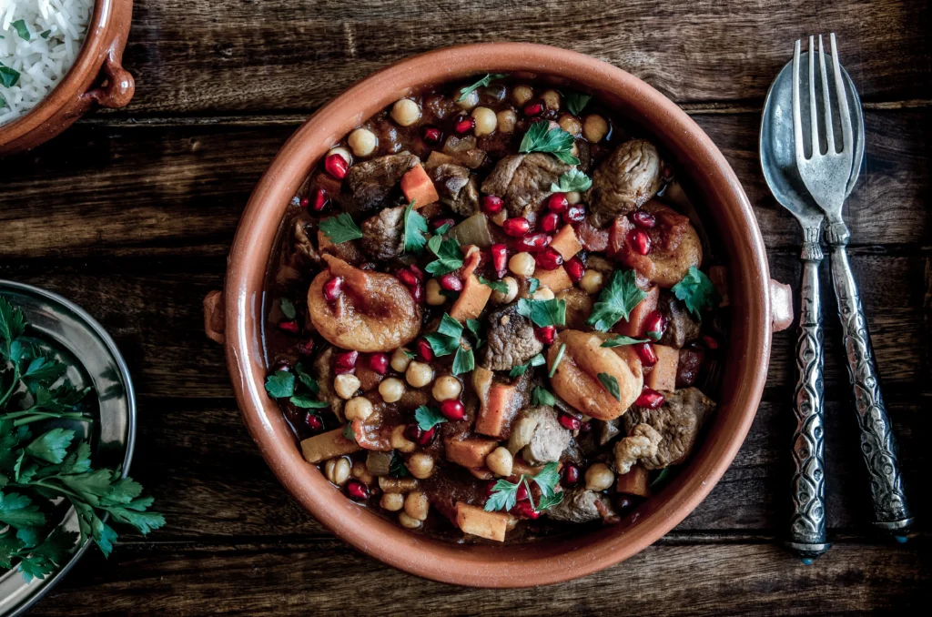 Due to its geography and history, the cuisine of Morocco is a heady mix of Arab, Berber, Moorish, French, Middle Eastern, Mediterranean African, Iberian, and Jewish influences. Dishes frequently feature dried and fresh fruits – apricots, dates, figs, and raisins, to name but a few. Nuts are popular too with pine nuts, almonds, and pistachios showing up in all sorts of dishes. Think of Moroccan food and deliciously aromatic dishes such as tagine immediately come to mind.